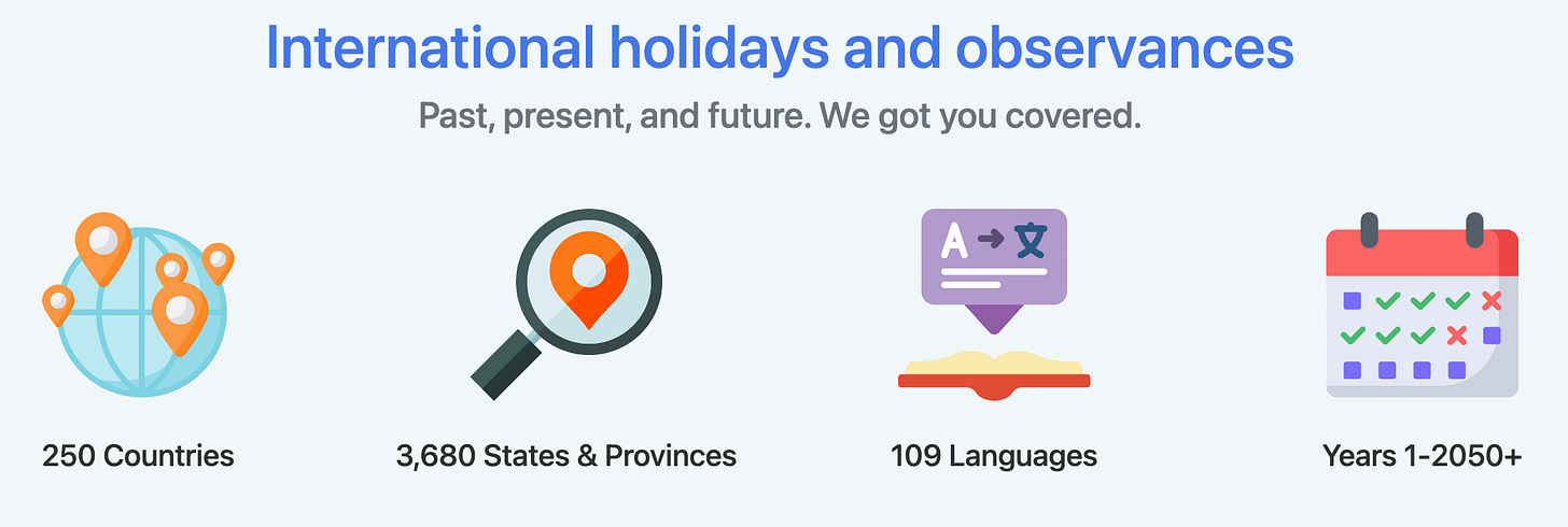 홀리데이 API는 오래된 홀리데이 데이터로 가득한 데이터베이스와 스프레드시트를 없애야 하는 임무를 수행하고 있습니다. 이 문제에 대한 우리의 알고리즘 접근 방식을 통해 몇 분 안에 애플리케이션에 추가할 수 있는 정확한 최신 홀리데이 정보를 제공할 수 있습니다. 즉시 계산을 통해 광범위한 과거 및 미래 데이터를 제공할 수 있습니다. 우리는 홀리데이와 기념일, 전 세계에서 사용되는 다양한 달력, 그리고 이 모든 것을 작동시키는 수학에 집착합니다.