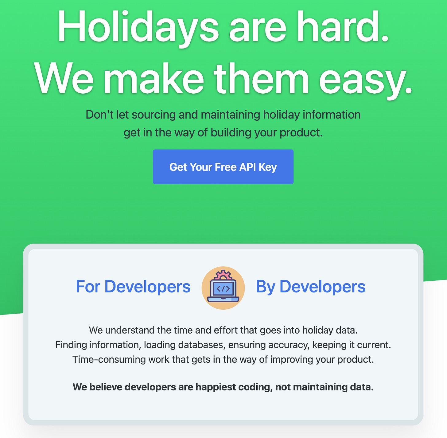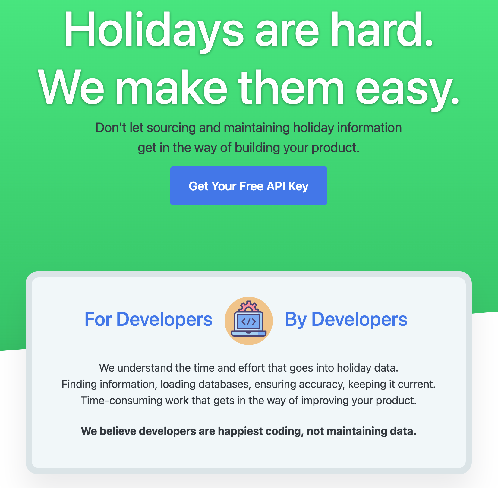 Holiday API를 개발한 개발자 Josh Sherman은 직장을 다니며 사이드 프로젝트를 진행했다고 해요. 그렇게 진행한 사이드 프로젝트 중 대박 난 것이 Holiday API였어요.